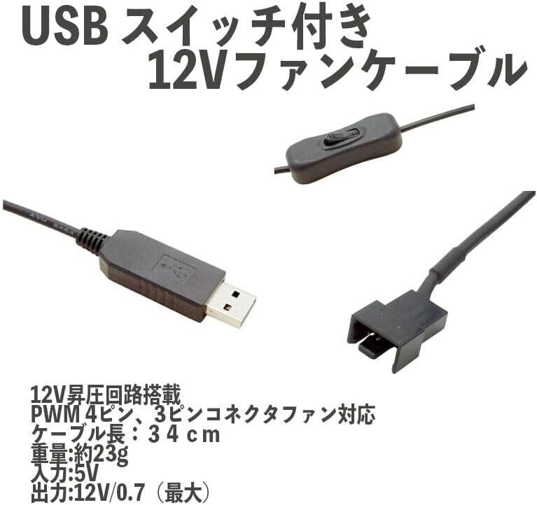 XYZA 風神 PC ファン用 スイッチ付き USB電源 変換ケーブル 12V 昇圧回路内蔵 3pin 4pin対応 [ 34cm ] XA-PWM12VSW